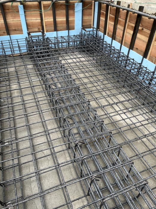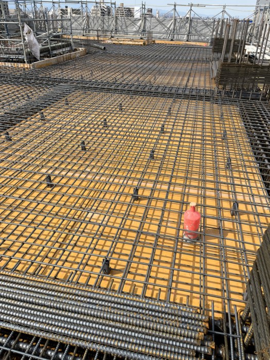 季節外れの暑さに汗を滲ませながらも、1階小梁とスラブ配筋が完了致しました。